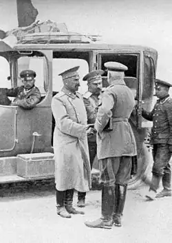 Hermann von François (mit dem Rücken zur Kamera) begrüßt den in Gefangenschaft geratenen russischen General Klujew, Chef des XIII. Armeekorps, am 31. August 1914