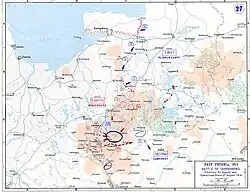 Die Schlacht bei Tannenberg war eine Schlacht des Ersten Weltkrieges und fand in der Gegend südlich von Allenstein in Ostpreußen vom 26. August bis zum 30. August 1914 zwischen deutschen und russischen Armeen statt. Die deutsche Seite stellte hierbei 153.000, die russische 191.000 Soldaten ins Feld.[1] Sie endete mit einem Sieg der deutschen Truppen und der Zerschlagung der ins südliche Ostpreußen eingedrungenen russischen Kräfte.