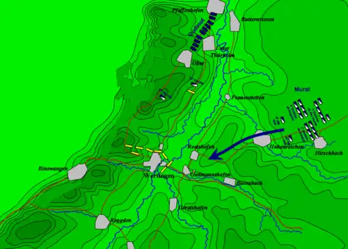 Murats Truppen umfassten die schweren Kavallerieeinheiten unter Louis Klein und Marc Antoine de Beaumont und leichte Kavallerieeinheiten, die von Antoine Charles Louis de Lasalle geführt wurden. Diese wurden durch Grenadiere unter dem Kommando von Charles Nicolas Oudinot und leichte Infanterie unterstützt.