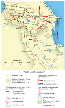 1918 versuchte Großbritannien Armenier davon zu überzeugen, den Kampf gegen das Osmanische Reich fortzuführen und gründete dafür die unter dem Befehl von Lionel Dunsterville stehende Dunsterforce, die zunächst in Bagdad stationiert war. Das militärische Ziel der Dunsterforce war das Erreichen des Kaukasus über die Front in Persien. Die Briten planten, eine Armee aus Armeniern und anderen der Entente gegenüber freundlich gesinnten Fraktionen im Kaukasus aufzustellen.[6] Am 10. Februar 1918 beschloss das Transkaukasische Kommissariat, die Unabhängigkeit ihrer Gebiete auszurufen und am 24. Februar 1918 wurde offiziell die Transkaukasische Demokratisch-Föderative Republik gegründet. Ihre anti-bolschewistischen politischen Ziele galten der Loslösung Transkaukasiens vom nunmehr bolschewistischen Russland. Bereits im Vorfeld hatte die Dunsterforce am 27. Januar 1918 Bagdad in Richtung Kaukasus verlassen, um die Kaukasusfront am Leben zu erhalten und die Pläne des osmanischen Generals Enver Pascha zu durchkreuzen. Am 17. Februar erreichte die Dunsterforce Bandar Anzali, wo sie jedoch von örtlichen Bolschewisten an der Weiterreise nach Baku gehindert wurde.[1]