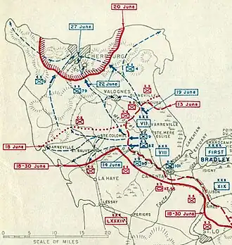 Die amerikanischen Verbände rückten daraufhin in nördlicher Richtung vor, eroberten Montebourg und Valognes sowie die nach Cherbourg führende Hauptstraße. Am 20. Juni zogen sich die Wehrmachtstruppen in die Stadt Cherbourg zurück.