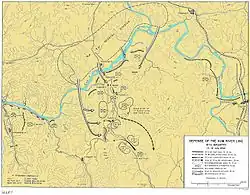 Am Morgen des 14. Juli stellten Soldaten des 3rd Battalion 34th IR von den Höhen über dem Kum-Fluss fest, dass Panzer vom Typ T-34 den Fluss überquerten. Sie wurden von diesen Panzern bereits von der gegenüberliegenden Seite des Flusses, allerdings ohne Wirkung, beschossen. Am Vormittag des gleichen Tages begann die nordkoreanische Infanterie damit, den Fluss auf Booten zu überqueren. Zur Feuerunterstützung wurden die amerikanischen Linien mit Mörsern und Artillerie beschossen.[10] Begünstigt durch die mangelhafte bzw. nicht vorhandene Kommunikation unter den US-Einheiten gelang es den Angreifern die Stellungen zu überrennen. Das weiter nördlich liegende 1st Battalion wurde ebenfalls massiv angegriffen und versuchte zunächst, die Angreifer durch Artilleriefeuer abzuwehren, musste sich jedoch schließlich in eine Auffangstellung zurückziehen.