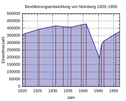In Nürnberg lebten gegen Ende des Zweiten Weltkrieges noch 196.270 Menschen. 415.813 Einwohner wurden im Jahr 1933[1] und rund 423.000 im Mai 1939 bei einer Volkszählung erfasst (siehe Einwohnerentwicklung von Nürnberg). Das Absinken der Bevölkerungszahl ist auf mehrere, in der Hauptsache kriegsbedingte Faktoren zurückzuführen. Ein Großteil der wehr- und arbeitsfähigen Männer war zu Wehrmacht, SS, Reichsarbeitsdienst und anderen militärischen und staatlichen Organisationen sowie zu Gliederungen der NSDAP eingezogen worden oder hatte sich freiwillig gemeldet. Zahlreiche Frauen waren zum Deutschen Roten Kreuz dienstverpflichtet worden oder hatten sich freiwillig gemeldet; dies war häufig mit einem Weggang aus Nürnberg verbunden. Im Zuge der „erweiterten Kinderlandverschickung“ und der „Mutter-Kind-Verschickung“ wurden, durch Hitlerjugend und Nationalsozialistische Volkswohlfahrt organisiert, Kinder und Jugendliche bis zum Alter von 14 Jahren sowie bei Kleinkindern auch deren Mütter in vor allem ländliche Gebiete verbracht, um sie der Gefahr durch Luftangriffe zu entziehen. Darüber hinaus wurde durch die Aktion „Verschickung zu Verwandten“ die Einwohnerzahl Nürnbergs weiterhin reduziert. Ausgebombte Nürnberger fanden teilweise Unterkunft auf dem Land; andere zogen aufgrund der besseren Versorgung mit Lebensmitteln in die umliegenden Dörfer, wenn ihnen das aufgrund der bestehenden Arbeitspflicht gestattet wurde.
