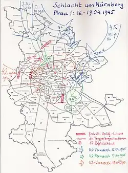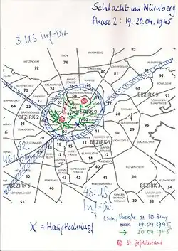 - ↑ Zu den Abschnitten ab 17. April 1945: Robert Fritzsch: Nürnberg im Krieg. Droste, Düsseldorf 1984, ISBN 3-8112-0697-4, S. 98 ff. und Michael Diefenbacher, Wiltrud Fischer-Pache: Der Luftkrieg gegen Nürnberg. Schmidt, Nürnberg 2004, ISBN 3-87707-634-3, S. 380 ff.