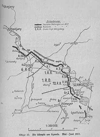 Am 31. Mai wurde das Korps „Morgen“ durch weitere Einheiten über Bajohren verstärkt: Detachement „Zanke“ (Führer der 72. Reserve-Brigade der 1. Reserve-Division), darunter das Reserve-Infanterie-Regiment Nr. 18, Garde-Schützen-Bataillon, Reserve-Jäger-Bataillon Nr. 3 sowie eine Feldartillerie-Abteilung und eine Eskadron wurden auf dem linken Flügel eingesetzt. Am 1. Juni konnte ein Angriff über den Venta-Dubysa-Kanal abgewiesen werden. Am 5. Juni erfolgte der Gegenangriff über den Kanal. Am 6. Juni gelang es Oberst Groß mit den Reserve-Infanterie-Regiment Nr. 18 bis Bubie vorzudringen, dem Vorgehen folgte Oberstleutnant Modrow mit dem Reserve-Infanterie-Regiment Nr. 59. Am 8. Juni wurde eine rückgängige Bewegung der russischen Truppen bemerkbar. Alle entbehrlichen Truppen wurden nun der 1. Res. Div. auf dem linken Flügel zugeführt. Außerdem wurden eine weitere Kavalleriedivision über Bajohren der 6. Kavallerie-Division zugeführt, die jetzt die Stärke eines Korps bekam und nach ihrem Führer Eberhard von Schmettow benannt wurde. Diese wurde vor allem gegen die Ussuri-Reiter-Brigaden, die russischen 4. Kavallerie-Division und die Kosaken-Divisionen eingesetzt. Allmählich verstärkten sich auch die russischen Kontingente. Das 3. Sibirische Armeekorps unter Generalleutnant Trofimow besetzte Schaulen. Am 12. Juni wurde Kužiai gestürmt und besetzt. Am 13. Juni 1915 besetzte die 1. Reserve-Division Kuzowimia, nordwestlich von Schaulen.[6] Aber auch die russischen Kräfte verstärkten sich. So wurden dem 3. Sibirischen Armeekorps vor allem kaukasische und turkmenische Regimenter zugeführt, so dass die 6. Kavallerie-Division nochmals zurückgehen und durch Teile der 1. Reserve-Division verstärkt werden musste. An eine Fortsetzung des Angriffs war nicht zu denken.