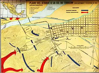 ![]() Plan der Schlacht um Torreón mit der Angriffsrichtung der Revolutionäre (rote Pfeile) und den Stellungen der Bundestruppen (blaue Linien) | |||||||||||||