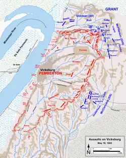 In der Nacht des 18. Mai erreichten die ersten Truppenteile der Tennessee-Armee die äußeren Befestigungsanlagen der Stadt. Grant wollte den Erfolg der Vortage ausnutzend die demoralisierten Konföderierten in einer letzten Anstrengung angreifen[7] und Vicksburg nehmen, bevor Johnston in seinem Rücken zu einer Gefahr für die Tennessee-Armee werden konnte.