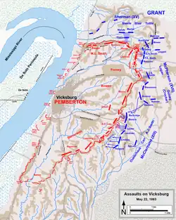 Die Schlacht um Vicksburg, auch Belagerung von Vicksburg genannt, fand vom 19. Mai bis zum 4. Juli 1863 rund um die Kleinstadt Vicksburg, Mississippi statt. Sie war die letzte Schlacht des Zweiten Vicksburg-Feldzugs und gilt als eine entscheidende Schlacht des Amerikanischen Bürgerkrieges.[4]