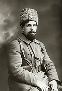| Die Kommandeure der gegnerischen Truppen während der Belagerung von Zarizyn im Jahr 1918: Links: General Konstantin Mamontow (1918), Kommandeur der Donarmee. Rechts: Josef Stalin während des 8. Parteitags der KPR(b) am 18. März 1919, fünf Monate nach seiner Rückkehr aus Zarizyn. | |