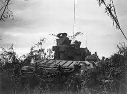 ![]() Ein Matilda-Panzer namens Clincher beim Marsch auf japanische Positionen bei Finschhafen, 9. November 1943 | |||||||||||||||||