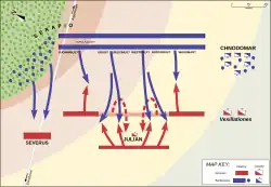 Nach den Aufzeichnungen des spätrömischen Historikers Ammianus Marcellinus sandte der römische Kaiser Constantius II. seinen Vetter Julian und den römischen Heermeister Barbatio nach Rauracum (heute Kaiseraugst), um die Alamannen zu bezwingen. Aufgrund des Laeten-Aufstands und laut Ammianus Marcellinus auch durch das Verschulden Barbatios, der Julian angeblich keine Erfolge gönnte, gelang es den Alamannen, das zahlenmäßig überlegene römische Heer in die Flucht zu schlagen.[2] Die Alamannen nutzten die Gelegenheit und besetzten zahlreiche linksrheinische Städte von Straßburg über Zabern, Speyer, Worms, Mainz, Bingen, Koblenz bis Andernach.