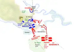 Die Schlacht von Bannockburn am 23. und 24. Juni 1314 war eine der entscheidenden Schlachten in den Schottischen Unabhängigkeitskriegen des späten 13. und des 14. Jahrhunderts. Im Sumpfland von Bannockburn in der Nähe von Stirling errang das schottische Heer unter der Führung von Robert (the) Bruce einen entscheidenden Sieg gegen ein erheblich größeres englisches Heer unter Eduard II.[7]