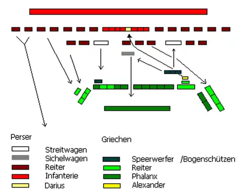Dareios hatte das Schlachtfeld vorher erkunden und für seine Reiterei und die Streitwagen einebnen lassen. Erstmals wurden von den Truppen des Dareios Fußangeln (umgangssprachlich Wölfe) als Hindernisse auf dem Schlachtfeld verteilt. In vorderster Linie platzierte Dareios einen Großteil seiner Kavallerie sowie Sichelwagen und Kriegselefanten. Auf der rechten Flanke war dies armenische und kappadokische Kavallerie, im Zentrum gefolgt von zwei Gruppen von je 50 Sichelwagen, den 15 indischen Kriegselefanten sowie weiteren 100 Sichelwagen. Die linke Flanke der vordersten Linie wurde von der schweren baktrischen und skythischen Kavallerie gebildet. Die zweite Linie bestand neben weiterer Kavallerie vor allem aus Bogenschützen und Infanterie, in deren Zentrum Dareios selbst, flankiert von den griechischen Söldner-Hopliten, stand. Die dritte Linie diente als Reserve und setzte sich aus Infanterie-Truppen zusammen, die in tiefer Staffelung hinter dem Zentrum aufgestellt waren. Die Aufstellung der Truppen erfolgte gestaffelt auf einer Breite von drei bis vier Kilometern. Eine Umfassung durch die zahlenmäßig unterlegenen makedonischen Kräfte war nicht zu befürchten.