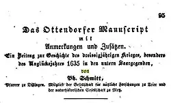 - ↑ Philipp Schmitt: Das Ottendorfer Manuscript mit Anmerkungen und Zusätzen. Ein Beitrag zur Geschichte des dreissigjährigen Krieges besonders des Unglücksjahres 1635 in den unteren Saargegenden. Trierisches Archiv für Vaterlandskunde, Hintz'sche Buchhandlung, Trier 1841, S. 119