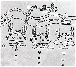 Als Gallas mit dem Gros seines Heeres erschien, hatte die Nachhut der verbündeten französischen Heere unter Kommando des Vicomte de Turenne bereits die Saar überschritten und die Brücke danach vernichtet. Dem kaiserlichen Heer gelang es aber, nördlich von Dillingen bei Rehlingen auf das jenseitige Ufer der Saar überzusetzen.[4] Als die kaiserliche Kavallerie zum Angriff überging, stellte der Vicomte de Turenne seine Truppen in Schlachtordnung auf. Die Gensdarmes de cheveaulegers der Garde und die Gensdarmes von Luxemburg hatten je nur Kompaniestärke von etwa 100 Kürassieren. Nur das Regiment von Josias Rantzau war neu aufgestellt worden und bestand aus mehreren Schwadronen. Das Bataillon der Schweizer Garden wurde befehligt von Marquis de Coislin. Es bestand aus vier Kompanien mit Kompaniestärke von je 200 Mann. Die zwei Bataillone französischer Garden bestanden aus jeweils sechs Kompanien. Sie wurden von Savignac und Marschall Comte de Guebriant geführt im weimarischen Heer. Die französischen Garden waren zunächst 1200 Mann stark. Beim Übergang über die Saar waren diese Truppenteile aber schon sehr zusammengeschmolzen.[3]