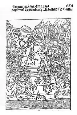 - ↑ Der im Bild der Koelhoffschen Chronik dargestellte „Wagen mit Schlüssel“ ist nicht der Fahnenwagen des Erzbischofs, sondern der Wagen der Kölner Bürgerschaft, also der Widersacher. Vgl. hierzu Ernst Voltmer: Standart, Carroccio, Fahnenwagen. Zur Funktion der Feld- und Herrschaftszeichen mittelalterlicher Städte am Beispiel der Schlacht von Worringen. In: Blätter für deutsche Landesgeschichte 124, 1988, S. 187–209