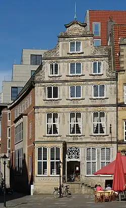 - Schlachte 31B: Das Pflügersche Kontorhaus wurde nach Plänen des Bildhauers Theophilus Wilhelm Frese um 1755 im Stil des Rokokos von dem Weinhändler und Ratsherrn Johann Georg Hofschlaeger erbaut. Es hatte fünf Geschosse. 1836 kaufte Georg Friedrich Pflüger das Haus und richtete den Gasthof Stadt Paris ein. 1874 übernahm Gütermesser Carl Wilhelm Meyer das Gebäude. Am Anfang des 20. Jahrhunderts wurde nach Plänen von Albert Dunkel ein Neubau errichtet unter Wiederverwendung der Rokokofassade. Das Haus brannte 1944 aus. Die Fassade wurde 1957/58 für den Neubau Haus der Stadtsparkasse am Marktplatz Ecke Langenstraße wiederverwendet.