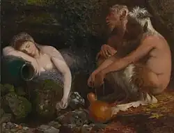 1877, während seines Aufenthalts in einem Atelier des Palazzo dei Pittori des russischen Malers Wladimir Dmitrijewitsch Swertschkow in Florenz, das er von 1874 bis 1885 nutzte, erarbeitete er auf der Grundlage von Vorstudien das Motiv zu diesem Bild. Hierbei stützte er sich auf eine mindestens 25-jährige Auseinandersetzung mit dem mythologischen Stoff. Als altmeisterliches Vorbild könnte das in München ausgestellte Gemälde Dianas schlafende Nymphen von Jan Brueghel dem Älteren gedient haben. Bereits 1852 hatte er mit „heidnischem Behagen“[4] in der Kohlezeichnung Römische Landschaft mit Faun und Nymphen einen Nymphen beschleichenden, bärtigen Faun gezeichnet. Dieses Motiv lehnte sein damaliger Mäzen Adolf Friedrich von Schack allerdings ab.[5] 1862 bearbeitete er die antike Gestalt der Diana nach dem ovidischen Stoff. Gestalten aus der griechischen Mythologie, insbesondere niedrige Naturdämonen wie Nymphen, Pane und Faune, die er als naturwüchsige Verkörperung des Eros, als Ausdruck der Wollust und Sexualität, auffasste, hatten es dem Künstler, der vor dem Hintergrund der Sexualethik des 19. Jahrhunderts von dem gründerzeitlichen Faszinosum des „ruchlos Sündig-Sinnlichen“ beeindruckt war,[6] besonders angetan. Entscheidenden Einfluss auf seine künstlerische Entwicklung nahmen pompejanische Wandbilder, die er 1863 bei seinem zweiten Italienaufenthalt in Neapel und Pompeji studiert hatte.[7]