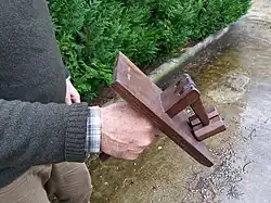 Bei den Schlagbrettern in den osteuropäischen Klöstern handelt es sich nicht um Klappern. Echte Klappern, bei denen ein Hammer wie ein Klöppel beim Bewegen des Schlagbretts aus dem Handgelenk eine Pendelbewegung ausführt,[17] sind die vor allem im alpenländischen Brauchtum in Österreich und Südtirol als Lärminstrument eingesetzten Klapperbretter. Sie werden an einem Handgriff unter dem Brett gehalten. Ministranten verwenden sie zusammen mit Ratschen anstelle von Messglocken bei vorösterlichen Gottesdiensten.[18] Früher sollten solche in der Hand gehaltenen Bretter außerdem „am Karfreitag dem Judas die Knochen brechen, bald die Gemeinde, die Bürger, das Gesinde zusammenrufen, das Wild dem Jäger entgegentreiben und die Sperlinge von der Saat scheuchen.“[19] Bei Prozessionen und im Ritus der römisch-katholischen Kirche in Lettland wurde das Klapperbrett klabeklis (in Litauen kleketas) verwendet.