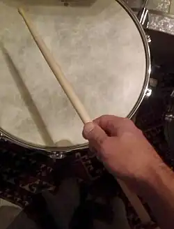 Dagegen sind beim „French Grip“ die Handflächen nach innen gerichtet, und die Hände können näher zusammengehalten werden, ohne dass sich die Sticks berühren. Die Sticks werden aus den Fingern, Handgelenk und Arm gespielt; es ist leichter, dynamisch und akzentuiert zu spielen (vor allem auch sehr leise zu spielen), dafür hat man nicht so viel Kraft bei den Schlägen.