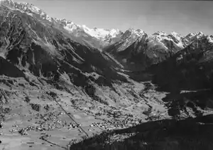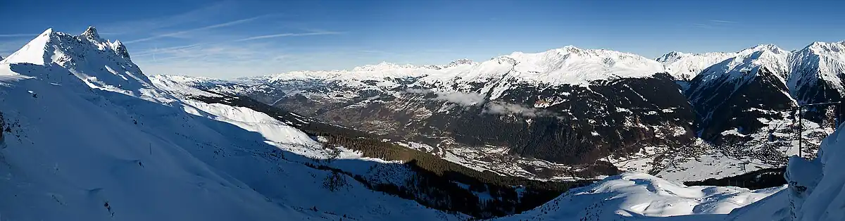 Blick vom Gotschnagrat auf Klosters Dorf (rechts), Serneus (Mitte) und Madrisahorn