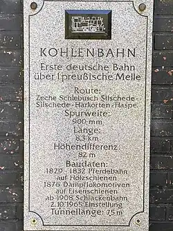 Der erste Teilabschnitt über eine Preußische Meile wurde bereits 1828 als Pferdeeisenbahn in Betrieb genommen, ein weiterer Abschnitt Ende des Jahres 1829,[5] sieben Jahre vor der Ludwigseisenbahn von Nürnberg nach Fürth und drei Jahre vor der Deilthaler Eisenbahn.[6] Sie war die erste Eisenbahn, die den Betrieb auf einer Länge von einer preußischen Meile aufnahm. Bis zum Kohlenmagazin an der Ennepe, unterhalb der Harkortschen Fabrik, wurde nochmals zwei Jahre gebaut. Der Anschluss an die Hasper Hütte erfolgte im Jahre 1858. Der wirtschaftliche Erfolg der Bahn darf bestritten werden angesichts des niedrigen Verkaufspreises von etwa 6.600 Talern im Jahre 1846.