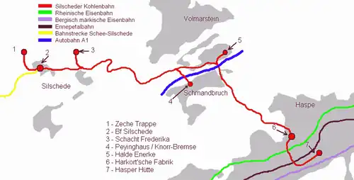![]() Karte der Schlebusch-Harkorter Kohlenbahn | |||||||||||||||||||||||||||||||||||||||||||||||||||||||||