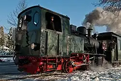 Ab 1877[7] wurde die Pferdebahn auf den Betrieb mit Dampflokomotiven umgestellt. In den ersten Jahren des Dampfbetriebs waren sie auf die Bedürfnisse der Strecke angepasst. Die Lokomotiven für den Schlackentransport der Hütte hatten zusätzliche Wassertanks. Auf der 4 km langen Strecke zur Schlackenhalde wurden zwei Kubikmeter Wasser verbraucht.[8] Später wurden B-Kuppler und vorwiegend Cn2t Maschinen von Henschel eingesetzt; sie unterscheiden sich durch die unterschiedlichen Achsfolgen und deren Antrieb.