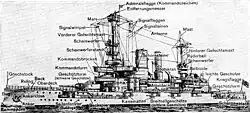 Die Bewaffnung bestand aus vier 28-cm-Schnellladekanonen L/40, 14 17-cm-Schnellladekanonen L/40, 20 8,8-cm-Schnellladekanonen L/35 sowie zeitweise vier Maschinenkanonen. Weiterhin waren sechs Unterwassertorpedorohre mit einem Durchmesser von 45 cm vorhanden. Im weiteren Verlauf wurde die Bewaffnung, abgesehen von der Hauptbewaffnung, mehrfach geändert.