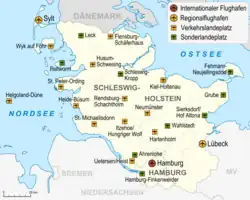 Das heutige Land ging am 23. August 1946, also kurz nach dem Zweiten Weltkrieg, aus der Provinz Schleswig-Holstein im Freistaat Preußen hervor.[7] Es grenzt im Norden an die dänische Region Syddanmark, über eine Seegrenze im Fehmarnbelt an die dänische Region Sjælland, im Süden an das Land Niedersachsen und die Freie und Hansestadt Hamburg sowie im Südosten an das Land Mecklenburg-Vorpommern.