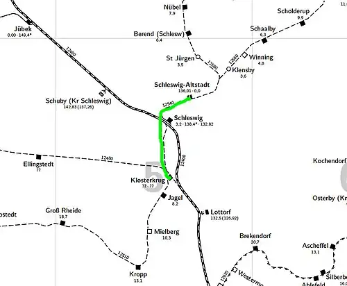 ![]() Strecke Schleswig-Klosterkrug–Schleswig-Altstadt 1858 bis 1869 | |||||||||||||||||||||||||||||||||||||||||||||||||||||||||||||