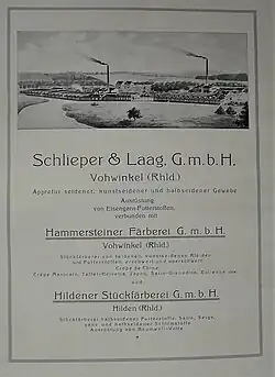 Ab 1942 hieß die Vohwinkeler Firma Schlieper & Laag GmbH, Stückfärberei und Appreturanstalt, V.-Hammerstein. Sie war Färberei, Druckerei und Appretur für leichte seidene und kunstseidene Gewebe; die erschwerten Seidenkreppgewebe; die asiatischen Gewebe (wie Pongés sowie chinesische Eichenspinnergewebe) und Helvetia und Toiles.