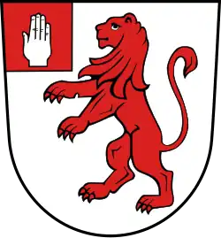 Blasonierung: „In Silber (Weiß) ein roter Löwe, im rechten roten Obereck eine rechte silberne (weiße) Verkehrthand (Schwurhand).“[8] |