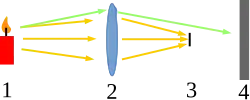 Die nebenstehende Abbildung zeigt das Funktionsprinzip der Schlierenfotografie. Die zu untersuchende Volumenregion bzw. Schicht (hier: eine brennende Kerze mit Konvektion) (1) wird von links mit parallelem Licht (z. B. eine Punktlichtquelle + Kollimator, beides nicht abgebildet) beleuchtet und durch ein Objektiv (2) auf dem Schirm (4) abgebildet. Der Großteil des Lichts (gelbe Pfeile) trifft auf eine Blende (3), oft in Form einer Kante. Dichteschwankungen eines inhomogenen Mediums in der Schicht (1) leiten einen Teil der Lichtstrahlen (grüner Pfeil) an der Blende (3) vorbei; fast nur dieses Licht erzeugt das Abbild auf dem Schirm. Die Helligkeitsschwankungen dieses Abbildes entsprechen den örtlichen Gradienten des Brechungsindex, veranlasst durch die Dichteschwankungen bzw. Vermischung. Für ein kontrastreiches Bild der Strömung muss das Licht scharf auf die Kante der Blende (3) fokussiert werden, was durch eine möglichst punktförmige Lichtquelle und die Anordnung der Blende in der Bildebene der Lichtquelle erreicht wird.