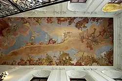 Das Deckenfresko ist ein Original vom alten Speisesaal und zeigt die Verherrlichung von Thronfolger Joseph als tugendhaftem Kriegshelden, der schließlich als Sieger den Lorbeerkranz vor dem Thron der Ewigkeit empfängt. Das Fresko wurde vom italienischen Maler Sebastiano Ricci in den Jahren 1701/1702 ausgeführt.[15] Ob der Name der Stiege vom blauen Läufer stammt oder vom blauen Himmel des Deckengemäldes, ist nicht ganz eindeutig.