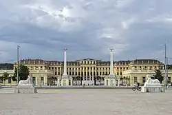 Schloss Schönbrunn geht in seiner heutigen Form auf eine Ende des 17. Jahrhunderts von Kaiser Leopold I. begonnene Anlage zurück, die Erzherzogin Maria Theresia Mitte des 18. Jahrhunderts vollenden ließ. Die ehemalige Sommerresidenz liegt im 13. Wiener Gemeindebezirk Hietzing. Der Name Schönbrunn bezieht sich auf einen Kaiser Matthias zugeschriebenen Ausspruch. Er soll dort im Jahr 1619 auf der Jagd eine artesische Quelle entdeckt und darüber erfreut ausgerufen haben: „Welch’ schöner Brunn!“ An dieser Stelle im Schlosspark befindet sich heute der Schöne Brunnen. Mitte des 17. Jahrhunderts war ein Schlossbau als Residenz für die zweite Ehefrau des Kaisers Ferdinand II., Eleonora Gonzaga, errichtet worden. Diese Anlage wurde bei der Zweiten Wiener Türkenbelagerung 1683 schwer beschädigt. 1687 gab Leopold I. weit vor den Toren der Stadt für seinen Thronfolger Joseph I. einen barocken Neubau von Johann Bernhard Fischer von Erlach in Auftrag, der von 1695 bis 1700[2] ausgeführt wurde.