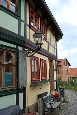 Das zweigeschossige Fachwerkhaus entstand um das Jahr 1800. Es ist an den abknickenden Verlauf der Gasse angepasst und verfügt so über drei Wandflächen. Im Erdgeschoss ist die Fachwerkfassade in Teilen verputzt. Die Haustür des Gebäudes ist in Formen des Jugendstils gestaltet und stammt aus der Zeit um 1900.