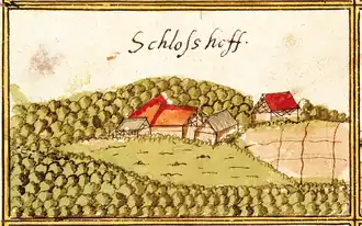 In der Römerzeit durfte die Gegend noch weitgehend unbesiedelt und von dichtem Wald bedeckt gewesen sein. Um 161 n. Chr. drangen römische Legionen vom Neckarbecken kommend in den Schwäbischen Wald vor und errichteten den Grenzwall, dessen Reste im Wald östlich des Schloßhofs noch sichtbar sind. Damit gehörte das Gebiet des Schloßhofs zum Dekumatland, dem rechtsrheinischen Teil der Provinz Germania superior. Mit dem Fall des Limes zogen sich die Römer wieder hinter den Rhein zurück. Es ist unklar, ob der Ortsname Schloßhof sich auf römische Gebäudereste bezieht oder auf eine mittelalterliche Burganlage zurückzuführen ist. Der Ortsname wurde im Jahre 1569 erstmals als Schloshove erwähnt. Nach der Beschreibung des Oberamts Backnang von Karl Eduard Paulus war „früher“ ein „künstlich aufgeworfener Hügel“ beim Schloßhof erkennbar, bei dem „von Zeit zu Zeit Backsteine, Ziegel etc.“ ausgegraben worden seien.[2] Nach dieser Beschreibung war die Burg Schloßhof wahrscheinlich eine kleine Turmhügelburg (Motte). Weiterhin kursierte im 19. Jahrhundert noch die Sage von einem Schloss, von der allerdings keine Details bekannt sind. Im 17. Jahrhundert (1686) entstand durch Andreas Kieser die erste gemalte Ansicht des Schloßhofs: Sie zeigt fünf Fachwerkhäuser, die von einer kleinen Feldmark und von Wald umgeben sind. Da das Gebiet des Schloßhofs wie Hinterwestermurr und Mettelberg lange zur Grafschaft Löwenstein gehörte, kam der Schloßhof zusammen mit diesen Orten 1843 zur Gemeinde Fornsbach. Bei dieser Gemeinde blieben die Orte bis zur Eingemeindung durch Murrhardt im Juli 1971.