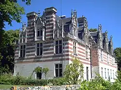 Das zweigeschossige Hauptgebäude im Stil des Flamboyants besteht aus einem spätgotischen Logis und einem daran anschließenden, schmaleren Flügel, der das Logis in nordöstlicher Richtung verlängert. Beide Bauten stammen aus der Zeit vor 1500 und wurden um die Jahrhundertwende[12] durch einen Pavillonbau miteinander verbunden. Dieser Pavillon steht in der Ecke von Logis und Verlängerungsflügel und nimmt das Treppenhaus auf. Seine beiden Außenseiten weisen neun große Rundbogenöffnungen (eine Haupteingangstüre im Erdgeschoss und acht verglaste Fenster) auf. Ab 1772 besaß der Treppenpavillon ein Geschoss mehr als heute. Die Legende besagt, dass dort ein Zimmer eingerichtet war, in dem die junge Tochter des Hauses, Marie de Caligny, versteckt wurde.[5] Dieses zusätzliche Geschoss wurde etwa ein Jahrhundert später wieder abgetragen und durch das heutige, hohe Walmdach mit Schieferdeckung ersetzt. Es wurde damit in seiner Erscheinung den übrigen Schieferdächern des Hauptgebäudes angepasst.
