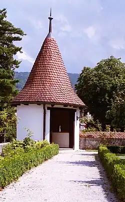 ![]() Schloss Aesch (Ostseite) mit Schlosspark und Springbrunnen (2009) | ||