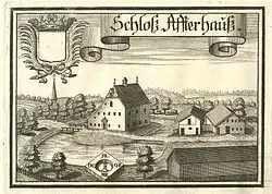1597 war in Afterhausen ein hölzernes Schloss vorhanden. Auf dem Stich von Michael Wening von 1721 ist das nun gemauerte Schloss Afterhausen ein zweigeschossiger Bau mit einem Krüppelwalmdach, das innerhalb eines Wassergrabens steht. Auf der Westseite ist das Dach bis zum Erdgeschoss herabgezogen. Zwei Übergänge führen zu dem Schloss. Ein besonders gearbeitetes Portal ist zu erkennen. Hinter dem Schloss befindet sich eine Kirche, außerhalb der Insel ist auch eine Hofstelle erkennbar.