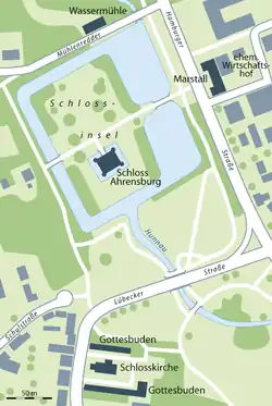 Das Schloss befindet sich im südlichen Bereich der rechteckigen Schlossinsel. Diese war mit ihrem von der Hunnau, einem Zufluss der Alster, gespeisten Graben und einem umlaufenden Wall ursprünglich bedingt befestigt. Der östlich aus dem verbreiterten Graben gebildete längliche Schlossteich diente als Staubecken für den Betrieb einer Wassermühle, die einst Teil der Gutswirtschaft war. Der Schlossteich ist heute ein Pachtgewässer des Anglervereins Ahrensburg von 1958 e. V.[41] Auf dem nördlichen Gelände der Insel standen bis zur Mitte des 19. Jahrhunderts verschiedene Nebengebäude. Die Bauten dieses Wirtschaftshofs wurden im Zuge der geplanten Umgestaltung der Schlossanlage zum Teil bereits unter Heinrich Carl Schimmelmann abgerissen.[7] Georg Greggenhofer entwarf stattdessen ein großes Torhaus, das als kombiniertes Kavaliershaus und Wirtschaftsgebäude dienen sollte.[39] Der U-förmige Komplex wäre ähnlich wie Greggenhofers Torhaus auf Gut Hasselburg gestaltet worden und hätte das Schloss gewissermaßen umklammert und an Grundfläche mehrfach übertroffen. Der barocke Bau geriet jedoch nie über den Planungszustand hinaus,[36] ebenso wenig wie ein Entwurf Carl Gottlob Horns von 1766, der das Schloss hofseitig durch viertelkreisförmige Mauern mit zwei Flügelbauten verbunden hätte.[42]