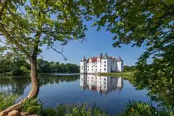 Im Ahrensburger Schloss kulminierte das althergebrachte Doppelhaus Schleswig-Holsteins in einer künstlerisch vollendeten Gestalt.[34] Während die zweifachen Doppelhäuser bereits seit dem Mittelalter als Wohnbauten auf den regionalen Wasserburgen verbreitet waren, setzten sich dreifach oder sogar mehrfach gestaffelte Häuser erst im 16. Jahrhundert durch. Auch wurden sie nicht immer wie Ahrensburg in einem Zug geplant, sondern wie zum Beispiel das Herrenhaus Ehlerstorf erst bei Bedarf erweitert.[37] Die Türme der Bauten erfüllten bis dahin vor allem eine zweckmäßige Funktion. So waren ältere Doppelhäuser häufig ohne, andere wie Breitenburg oder Wahlstorf lediglich mit einem Treppenturm, das ursprüngliche Kieler Schloss mit zwei Treppentürmen versehen. Das Glücksburger Schloss, das landesherrliche Gegenstück zum Ahrensburger Bau, war das erste Mehrfachhaus, das mit vier markanten Ecktürmen ausgestattet wurde, die zudem von vornherein als Wohnpavillons und nicht als Treppentürme gedacht waren.