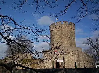 Der Bergfried, der zunächst in der ersten Hälfte des 19. Jahrhunderts restauriert wurde,[3] ist ein 19,3 m hoher runder Turm mit einem Durchmesser von 11 m. Er wurde innerhalb der Wehrmauer freistehend aufgemauert und dient heute als Aussichtsturm. Der Zugang erfolgt zunächst über eine geradläufige Steintreppe hinauf zur Wehrmauer und von dieser über eine Holzbrücke zum Eingang des Turms, der in 7,9 m Höhe liegt. Im Raum unterhalb dieses befindet sich das Verlies. Im Turm führt eine Holzwendeltreppe, im oberen Bereich eine Steintreppe zur Aussichtsplattform in 16,9 m Höhe. Hinter dem Treppenaustritt befindet sich ein kleines Podest in 17,9 m Höhe, neben dem eine Orientierungstafel angebracht ist.[4] Vom Turm hat man eine sehr gute Aussicht in die Rheinebene und entlang der Bergstraße, bei klarer Luft auch zum Taunus im Norden und zum Pfälzerwald im Westen.