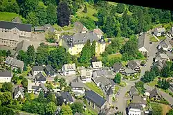 Ein vor dem Herrenhaus gelegener Innenhof wird von Wirtschaftsgebäuden und einer Kapelle eingefasst.