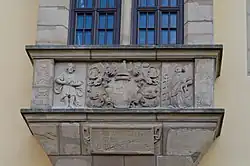 Auf der Hofseite des Gebäudes befindet sich ein Erker von 1536. An der Brüstung des Erkers befindet sich ein Relief mit dem Wappen des Bischofs Sigismund von Lindenau zwischen Darstellungen von Johannes dem Täufer, Stiftspatron von Merseburg, und Laurentius von Rom. Darunter befindet sich eine Inschrift.