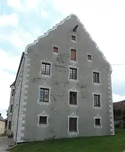 Das dreigeschossige Gebäude besitzt geschweifte Giebel und an der Nordostecke einen achteckigen Eckturm. Der südöstliche Eckturm wurde abgerissen. Giebel und Fenster sind in Sgraffitomalerei verziert, eine an Renaissancebauten in Oberitalien verwendete Art der Wandmalerei: