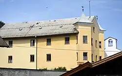 Das Schloss ist ein dreigeschoßiger würfelförmiger Bau mit einem hohen Walmdach. Das Gebäude besitzt schräg gestellte Eckerker, die mit der Giebelfront optisch verbunden sind; über einen Verbindungsgang gelangt man in die Kapelle. Erwähnenswert sind das Rundbogenportal an der Stirnfront, die Halle und die 1955 in der Kapelle freigelegten Fresken.