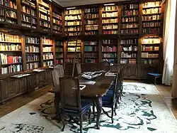 Die Bibliothek umfasst auf 55 m² (4,55 m × 5,60 m) eine Sammlung mit ca. 5.000 antiquarischen Büchern.[10] Bemerkenswert ist überdies der Zanetti-Saal mit dem Deckenfresko 'Sturz der Titanen' von Domenico Zanetti.[11]