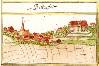 Das Schloss Bittenfeld ging aus einer mittelalterlichen Burg hervor. Erstmals erwähnt wurde Bittenfeld um 1200.[1] Die ersten Bewohner waren wohl Ortsadlige, das Geschlecht der Herren von Bittenfeld. Im Jahre 1308 werden die Ortsadligen Johann und Wolf von Bittenfeldt erwähnt. Das Geschlecht starb wohl im 14. Jahrhundert aus. Schon im 13. Jahrhundert (1237) besaß das Stift Backnang den so genannten Großzehnten in Bittenfeld. 1282 erwarb das Stift von Albert von Ebersberg noch den Kleinzehnten. Vom Stift Backnang gingen dessen Güter und Rechte durch Kauf 1453 an Graf Ulrich von Württemberg. Im 14. Jahrhundert diente Bittenfeld als Residenz des Grafen Ulrich IV., Bruder Graf Eberhards des Greiners. In einem Vergleich, welchen Ulrich ein Jahr vor seinem Tode mit Eberhard schloss, wurde ersterem auch die Burg Bittenfeld zugeteilt. Graf Ulrich starb 1366. Im Jahre 1435 verpfändeten die Grafen Ludwig und Ulrich von Württemberg den Brüdern Diebold und Hans von Bernhausen die Burg und das Dorf Bittenfeld. Später erscheinen die Herren von Bernhausen als württembergische Lehnsmänner in Bittenfeld. 1464 verkaufte Graf Ulrich V. von Württemberg das Dorf und Schloss Bittenfeld zusammen mit anderen Orten an Hans von Bernhausen dem Älteren für 7400 Gulden.[2] Im Jahre 1507 nennt sich ein Jakob von Bernhausen zu Bittenfeld. 1573 wurde Albrecht Oborsky mit Schloss Bittenfeld belehnt. Von diesem kam das Schloss 1574 an die Augsburger Patrizierfamilie Herwarth, die sich nun Herwarth von Bittenfeld nannte. Zunächst wurde Matthias Herwarth, Bürgermeister von Esslingen, mit dem Schloss belehnt. Zwischen 1593 und 1598 wurde das Schloss durch den Baumeister Heinrich Schickhardt vollständig neu gebaut. Für einige Generationen blieb das Schloss nun im Besitz der Familie Herwarth. Ein Lucas Herwarth zu Bittenfeld wurde von 1608 bis 1619 als württembergischer Vasall genannt. Ebenso 1633 ein Christian Herwarth von Bittenfeld und seine Brüder. Danach kam Schloss und Ort an die Familie Pfaudt von Kürnberg. 1652 wurden Umbauten am Schloss durchgeführt. 1664 kauften von Johann Philipp Pfaudt von Kürnberg und seiner Gemahlin Helene (geb. Bidembach) das Schloss nebst Hofgut von Herzog Eberhard III. von Württemberg für 5500 Gulden. Allerdings kam es durch Tausch bereits 1669 an die Witwe Sibylle Felicitas Schertlin von Burtenbach, anschließend an die von Münchingen und um 1700 an den württembergischen Oberstwachtmeister von Nettelhorst.